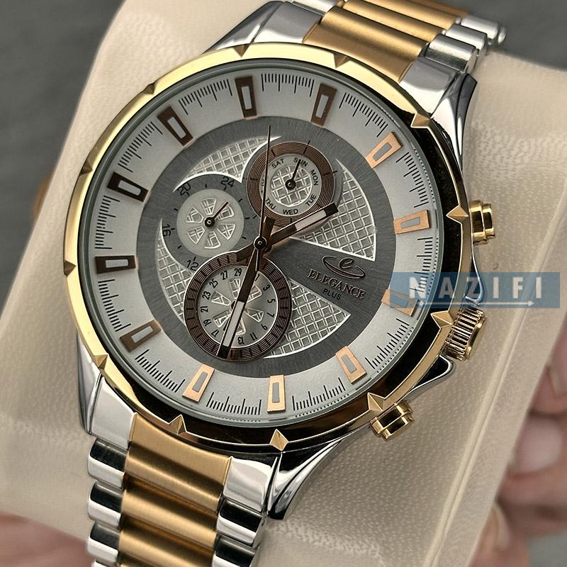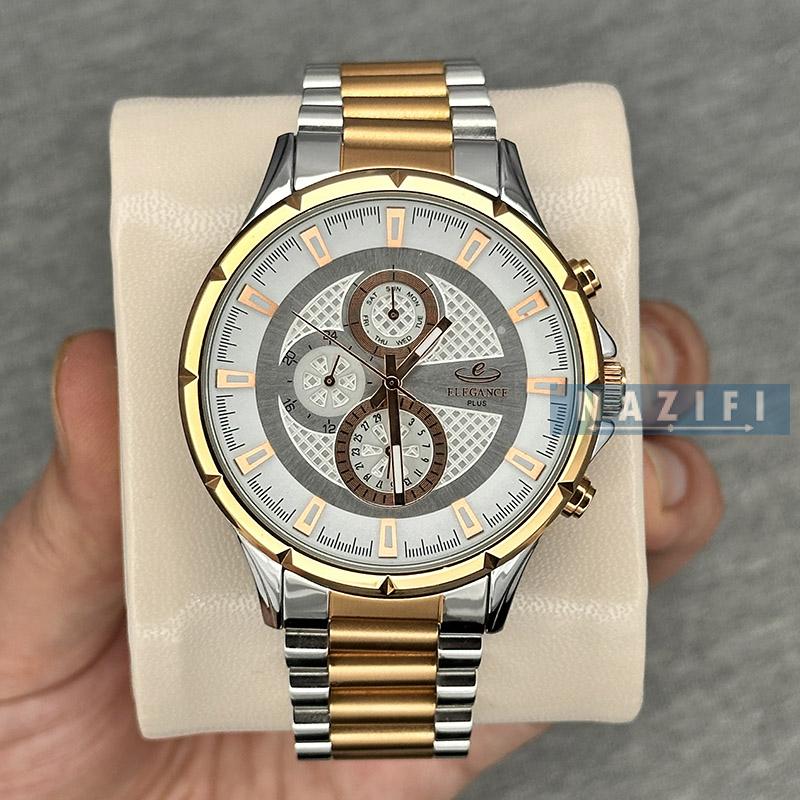 خرید اقساط ساعت مچی مردانه الگانس سه موتور فعال فول تایم EP0576G دو رنگ رزگلد نقره ای و بدنه استیل 316، بند استیل ضد حساسیت، صفحه نشکن و ضد خش و ضد آب.قاب درشت دقیق و ماندگار. خرید با ضمان و قیمت مناسب. پرداخت اقساط با اسنپ پی ، دیجی پی و ترب پی .