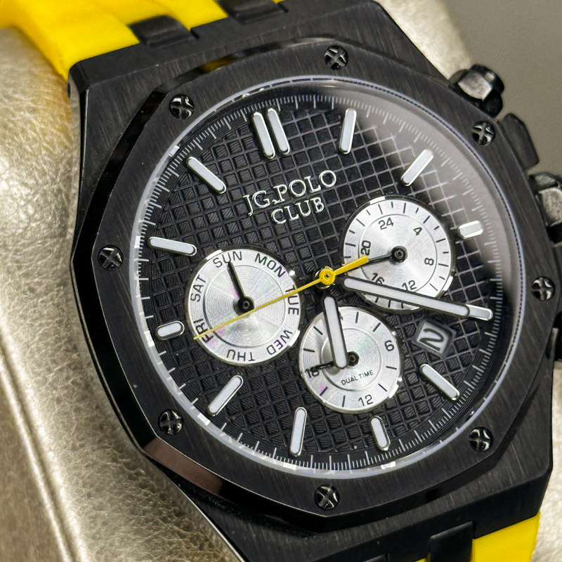 ساعت نظیفی ساعت مردانه ساعت مچی مردانه بند رابر جی جی پولو کلاب دوال تایم زرد صفحه مشکی 2900/8