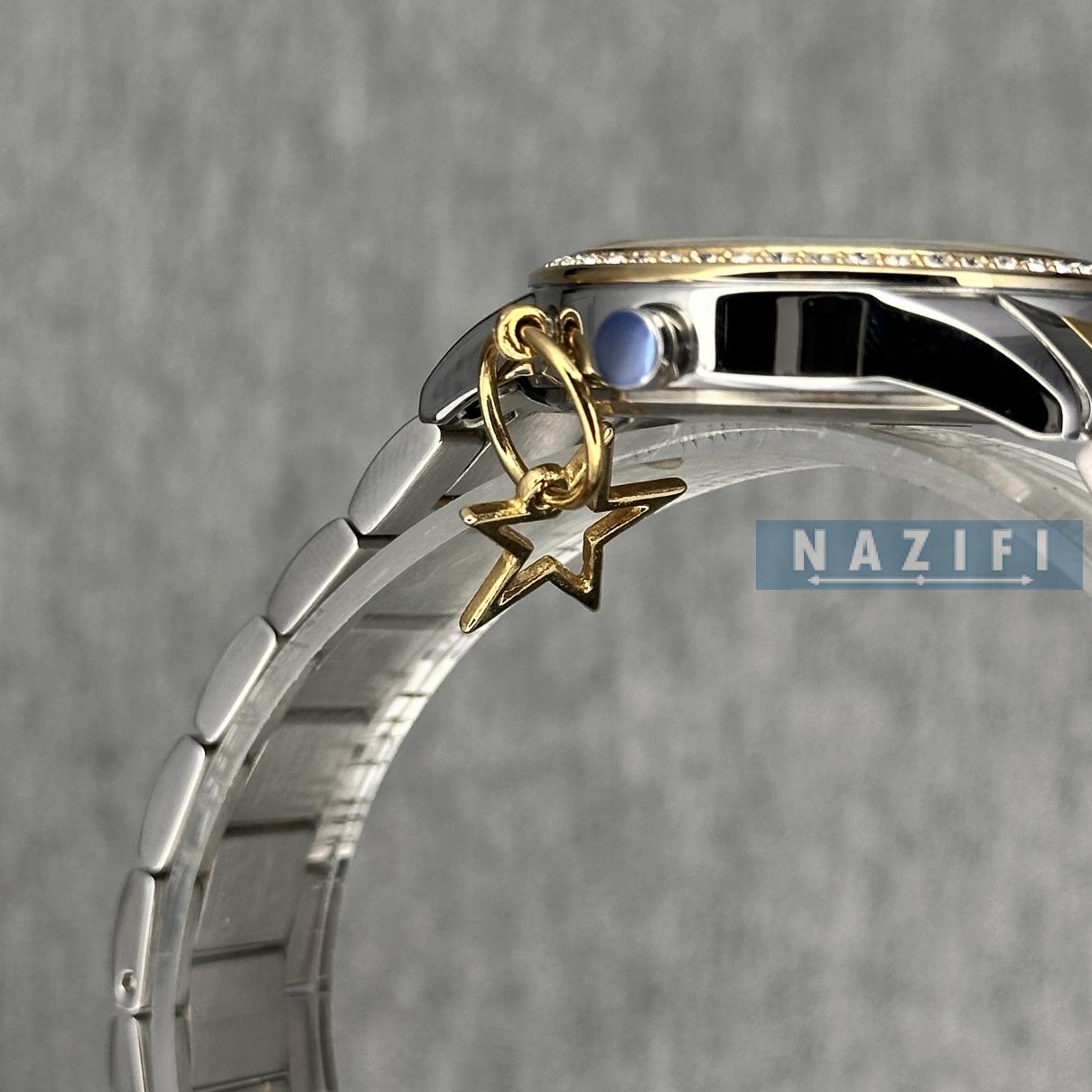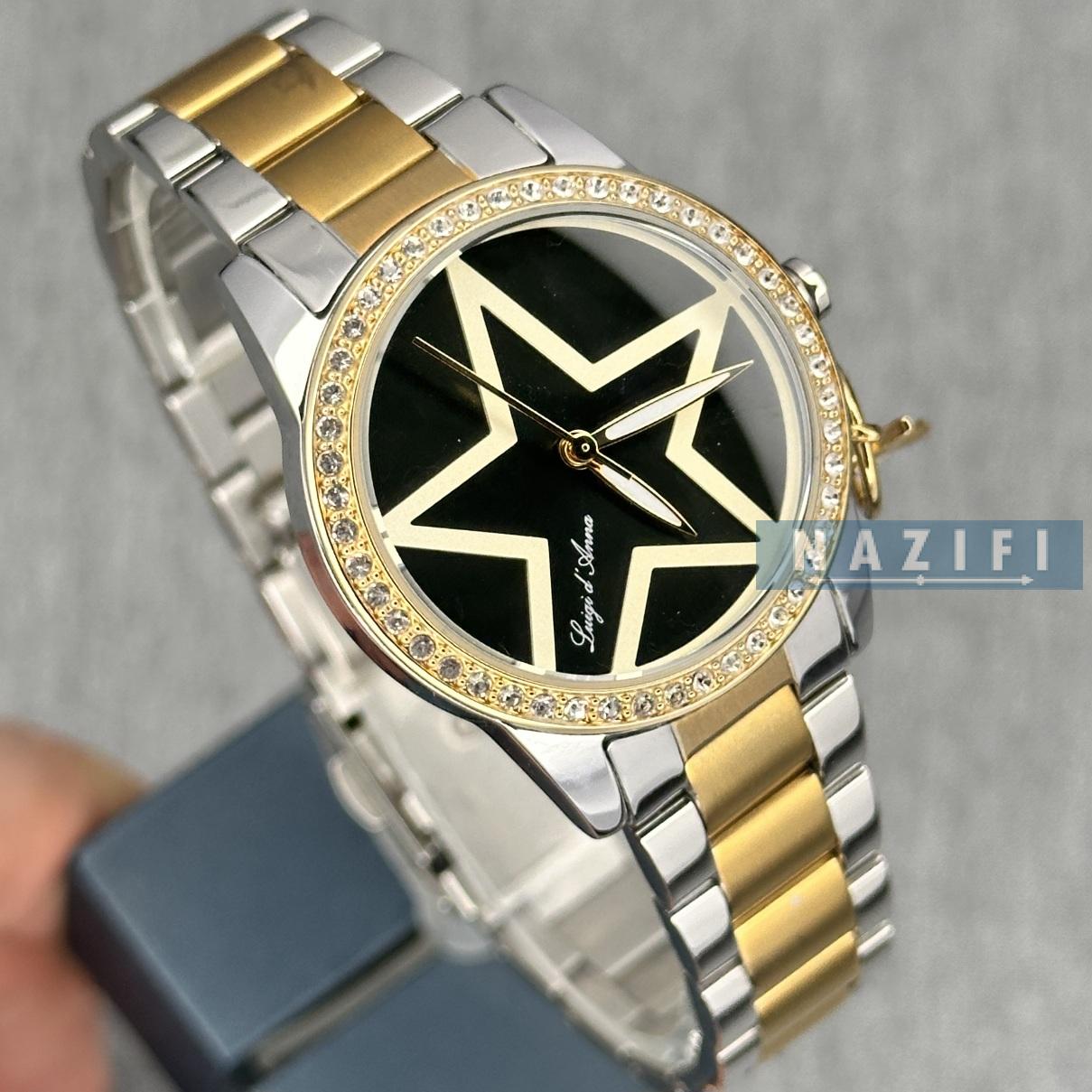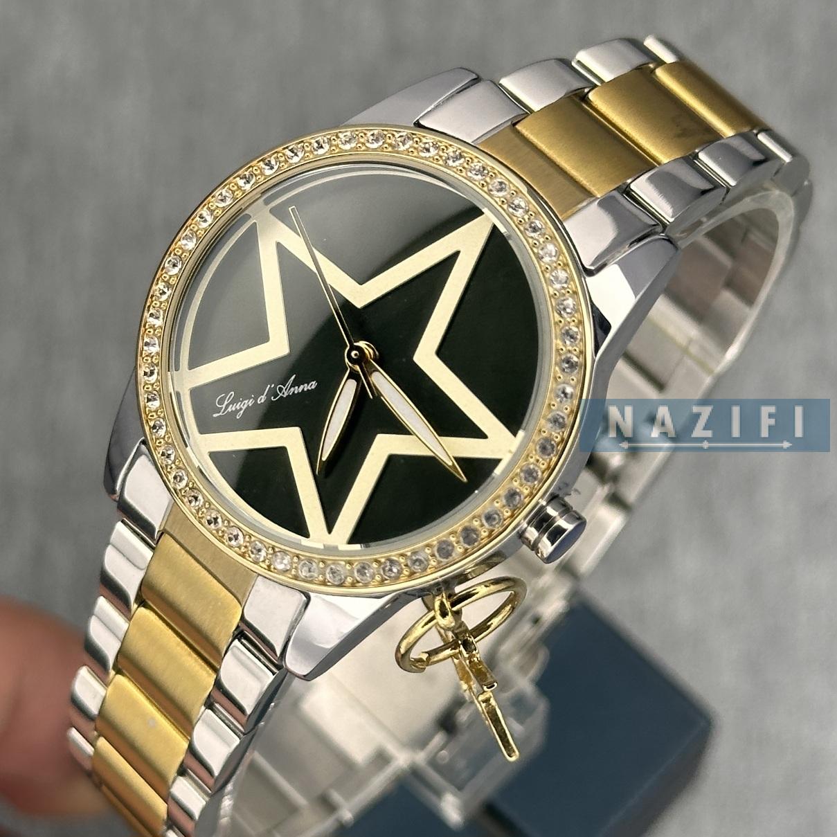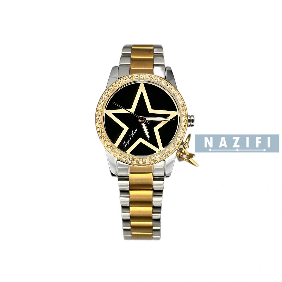 ساعت زنانه اورجینال ال دی ای کلاسیک طلایی - نقره ای LDA-KL2290 . تمام استیل دو رنگ صفحه ی سبز بسیار تیره ، دارای آویز ستاره ای متصل به قاب ساعت ، طرح صفحه ستاره ای و نگین های جایگذاری شده روی قاب با دستگاه. ارزان ترین قیمت بازار در فروشگاه ساعت نظیفی