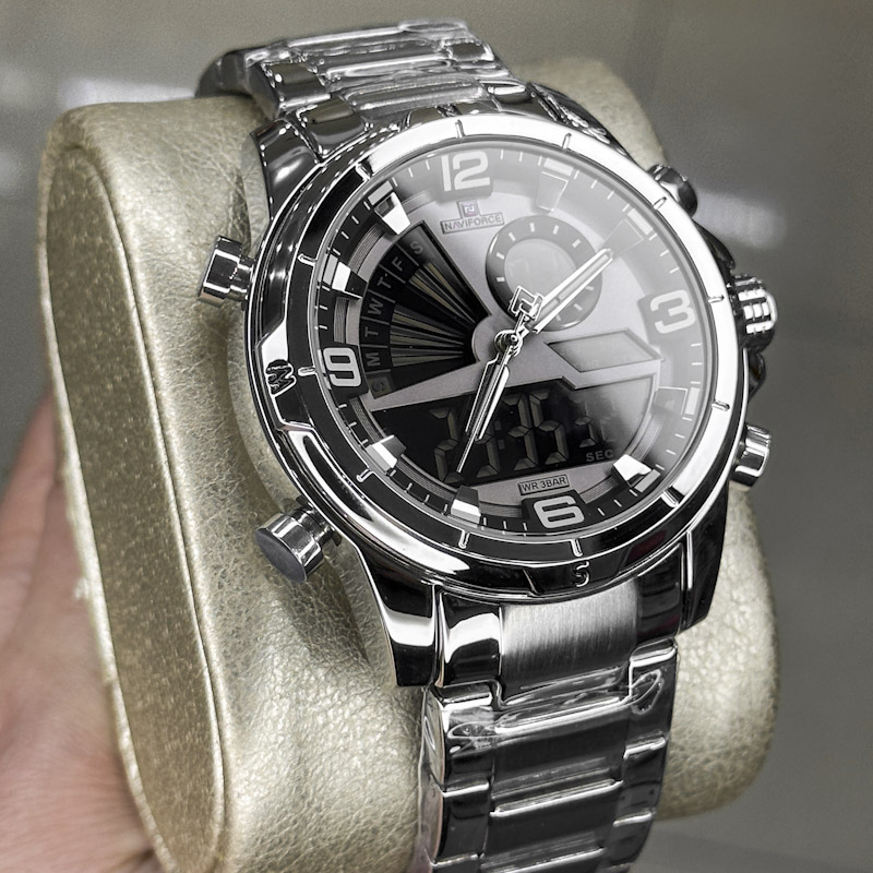 خرید قسطی| ساعت مردانه نیوی فورس دو موتوره انالوگ دیجیتال استیلنقره ای دو زمانه NF 92571