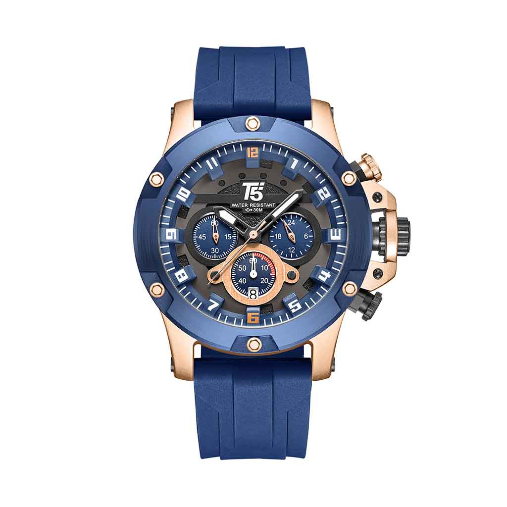 ساعت مچی اسپرت مردانه برند تی فایو T5 . سه موتوره ی کرنوگراف ، محصول کشور هنگ کنگ . بدنه ی این ساعت از جنس استیل ضد حساسیت و ضد زنگ ساخته شده . بند های این ساعت از جنس رابر بسیار لطیف و مقاوم و محکم ساخته شده که به لطف پین های متحرک دستی ، به شما امکان تعویض راحت بند ها رو میده . به عبارتی دیگه شما میتونید در کنار بند های فابریک ، برای هر رنگ لباس و استایلتون بند هم رنگش رو تهیه کنید و به این صورت برای هر ست از هر رنگ لباس و استایلتون ، بدون مراجعه به تعمیرگاه و بدون نیاز به ابزار به راحتی بند رو تعویض کنید و ساعتی با رنگ بند دلخواهتون داشته باشید . برای خرید بند های اضافه به واتساپ پیام بفرستید .