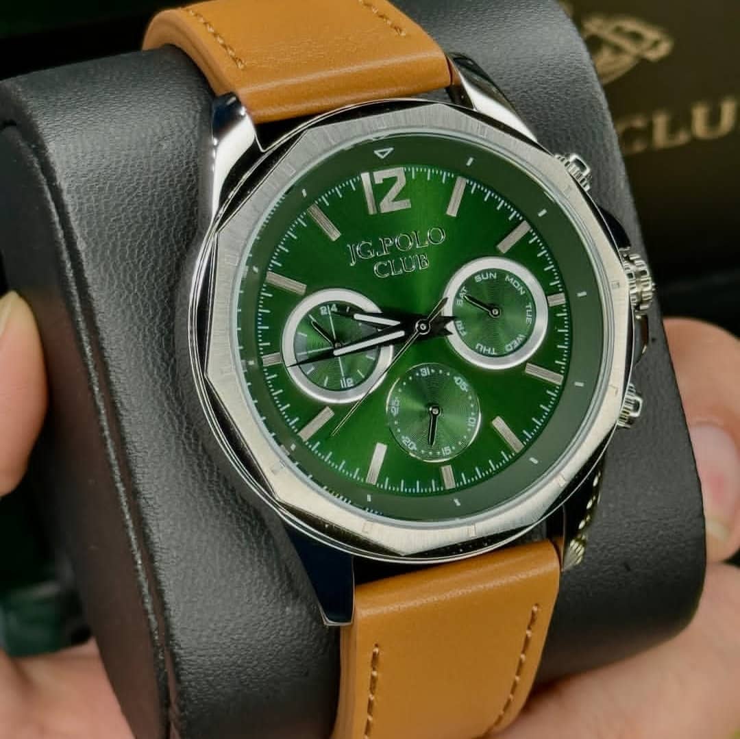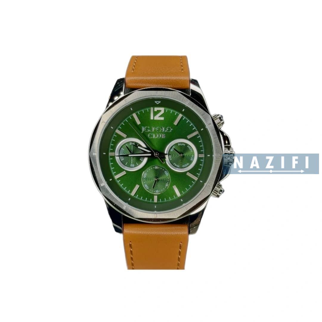ساعت پولوکلاب آمریکا، بند چرم با قاب نقرهای و صفحه سبز جادویی، سه موتوره با طراحی شیک و کیفیت بالا، انتخابی ایدهآل برای استایل خاص شما.
