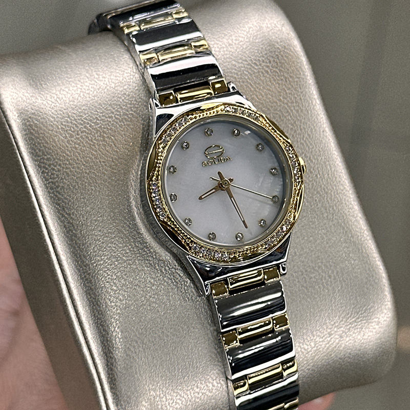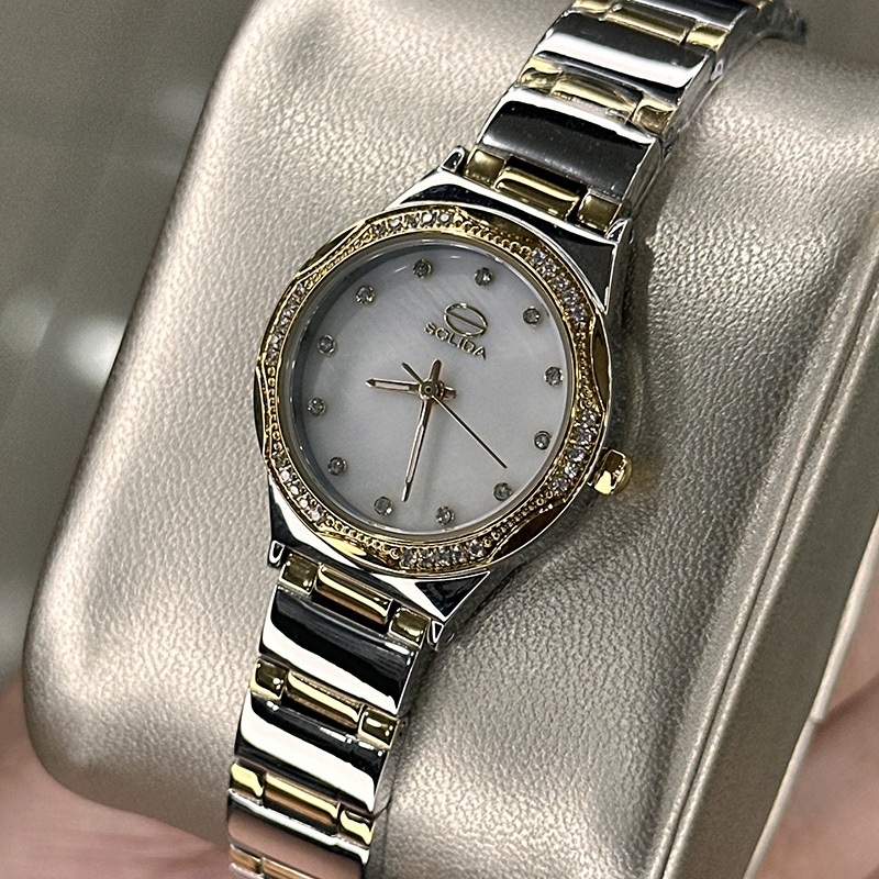 خرید قسطی | ساعت زنانه سولیدا اورجینال نقره ای طلایی قاب نگینی 5119/9
