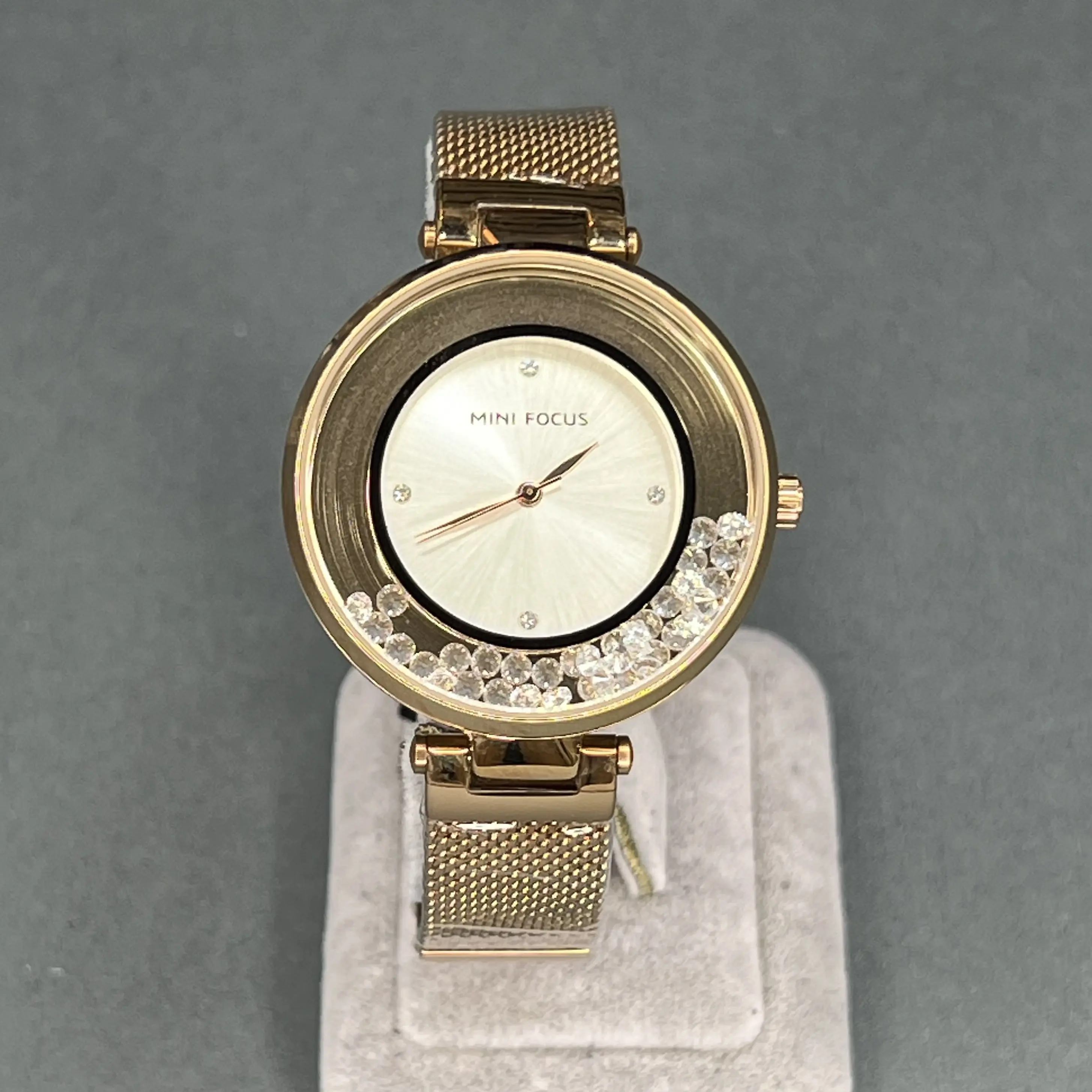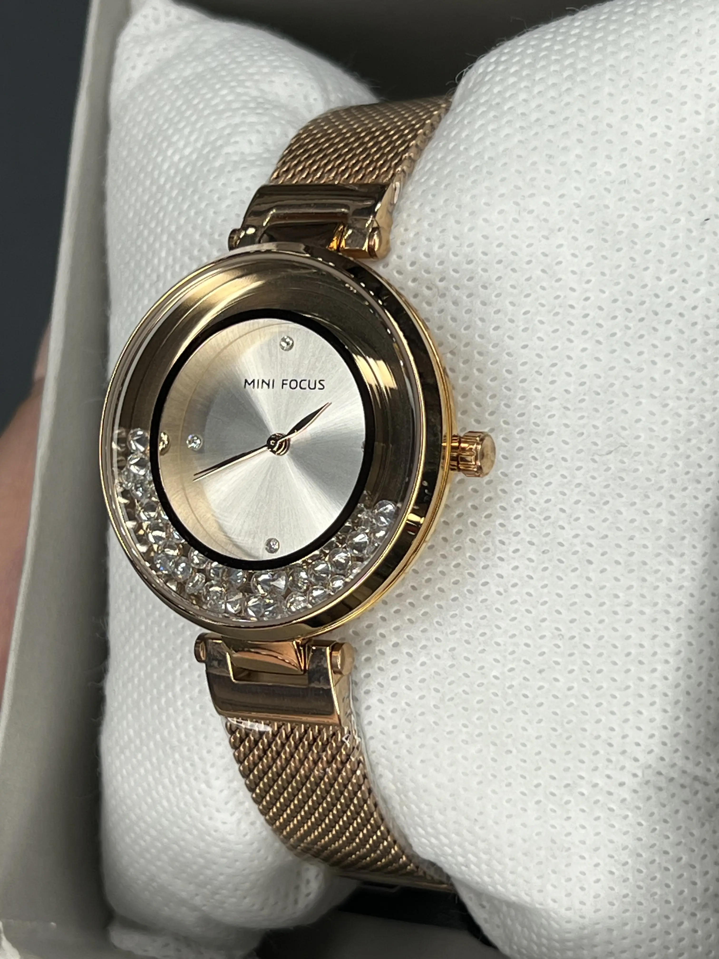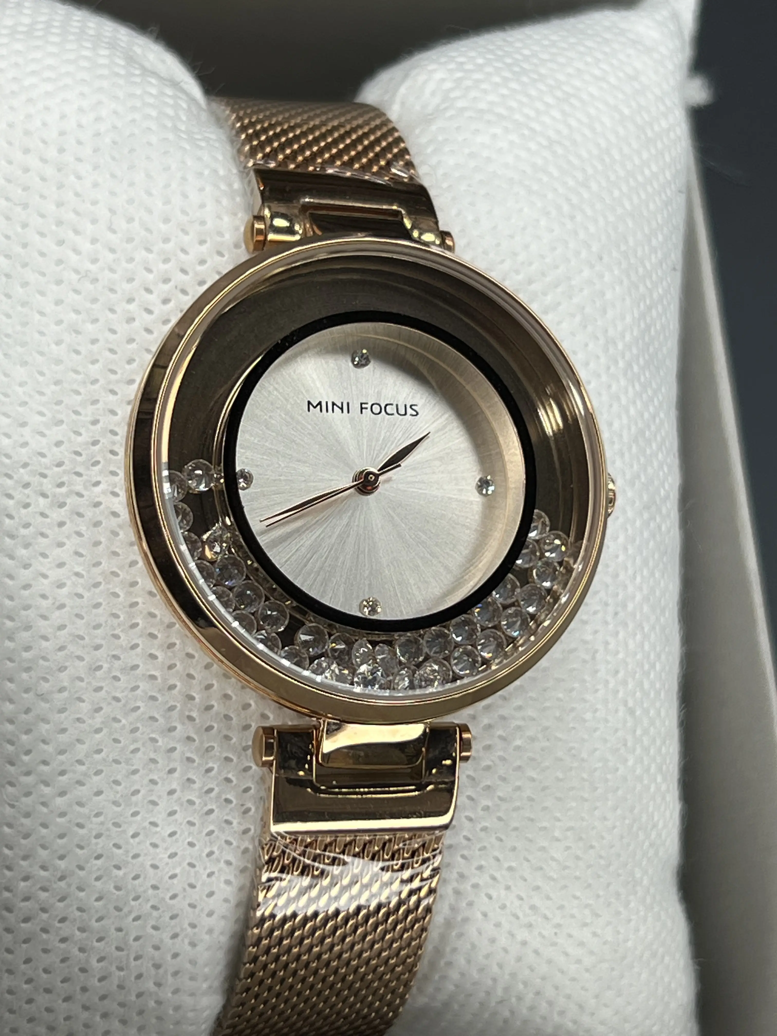 دارای نگین کاری معلق اطراف صفحه ی ساعت که با حرکت دادن دست جابجا میشوند ، دارای جعبه و پاکت و کارت گارانتی اصلی