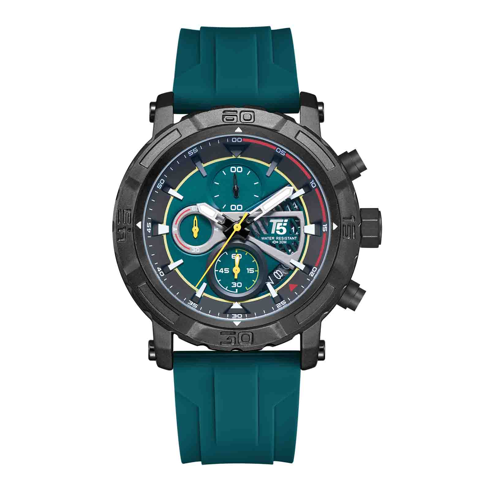 ساعت مچی اسپرت مردانه برند تی فایو T5 . سه موتوره ی کرنوگراف ، محصول کشور هنگ کنگ . بدنه ی این ساعت از جنس استیل ضد حساسیت و ضد زنگ ساخته شده . بند های این ساعت از جنس رابر بسیار لطیف و مقاوم و محکم ساخته شده که به لطف پین های متحرک دستی ، به شما امکان تعویض راحت بند ها رو میده . به عبارتی دیگه شما میتونید در کنار بند های فابریک ، برای هر رنگ لباس و استایلتون بند هم رنگش رو تهیه کنید و به این صورت برای هر ست از هر رنگ لباس و استایلتون ، بدون مراجعه به تعمیرگاه و بدون نیاز به ابزار به راحتی بند رو تعویض کنید و ساعتی با رنگ بند دلخواهتون داشته باشید . برای خرید بند های اضافه به واتساپ پیام بفرستید .