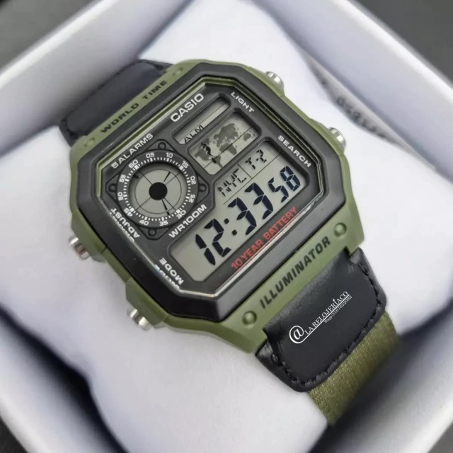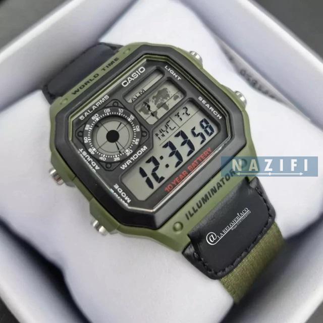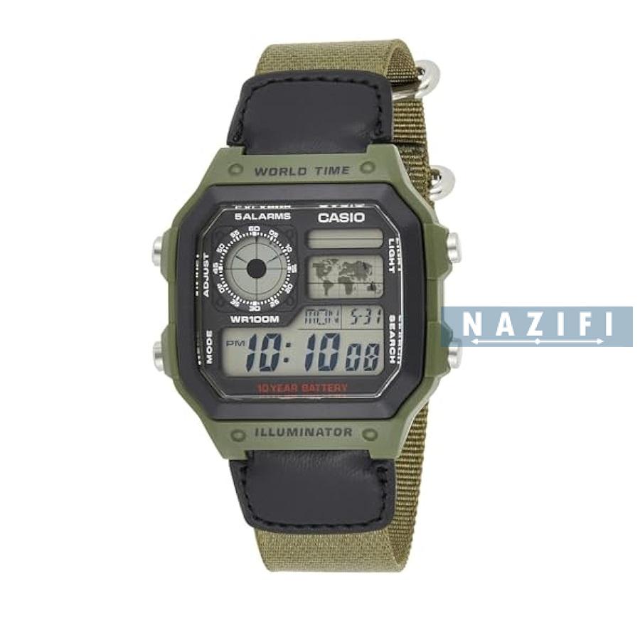 ساعت مچی مردانه کاسیو جهان نما بند برزنتی دیجیتالی ضد آب صد متر با باتری 10 ساله مناسب برای : آقایان مقاومت در برابر آب تا : 100 متر منبع انرژی : باتری معمولی فرم قاب : مربع | مستطیل رنگ بدنه : مشکی / دودی تیره جنس بند : پارچه یا برزنت نوع قفل : سگکی