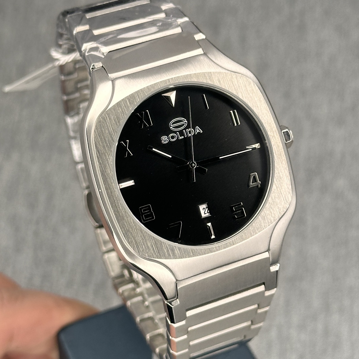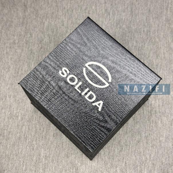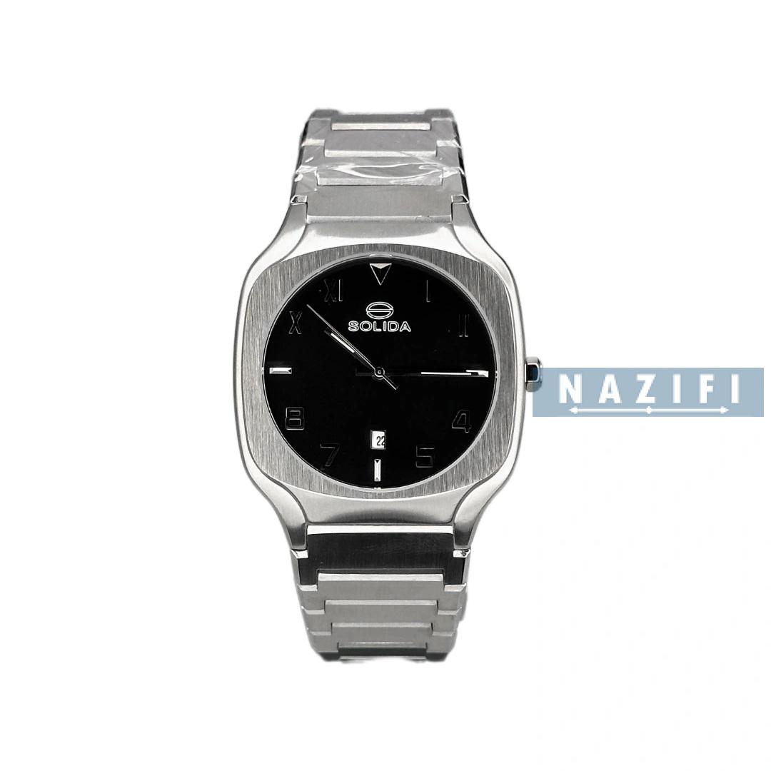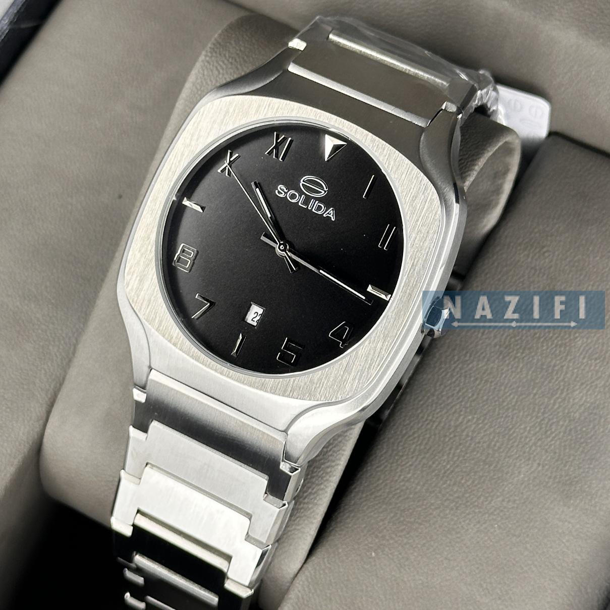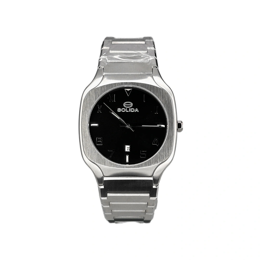 ساعت سولیدا مردانه ظاهری کلاسیک و جذاب دارد. اصلیترین چیزی که در ساعت مردانه سولیدا توجه ما را به خود جلب میکند، قاب مربع شکل و نقرهای رنگ ساعت است. اگر به درون صفحهی مشکی رنگ ساعت نگاه کنید، متوجه میشوید که اندکسهای این ساعت بهصورت ترکیبی، عددی و لاتین طراحی شدهاند. عقربههای آن شبنما هستند. یک مربع کوچک بالای عدد 6 قرار دارد که تقویم ساعت است. نام برند solida زیر ساعت 12 دیده میشود. در کنار صفحه یک پیچ کوک برای تنظیم زمان وجود دارد. این ساعت بند استیل، رنگ ثابت و ضدحساسیت است. بند ساعت از بافت یکدستی تشکیل شده و نقرهای رنگ است. این بند باعث تعرق و خارش نمیشود و قفل آن از مدل پروانهای دکمهدار است که از دسته قفلهای محکم و مطمئن است.