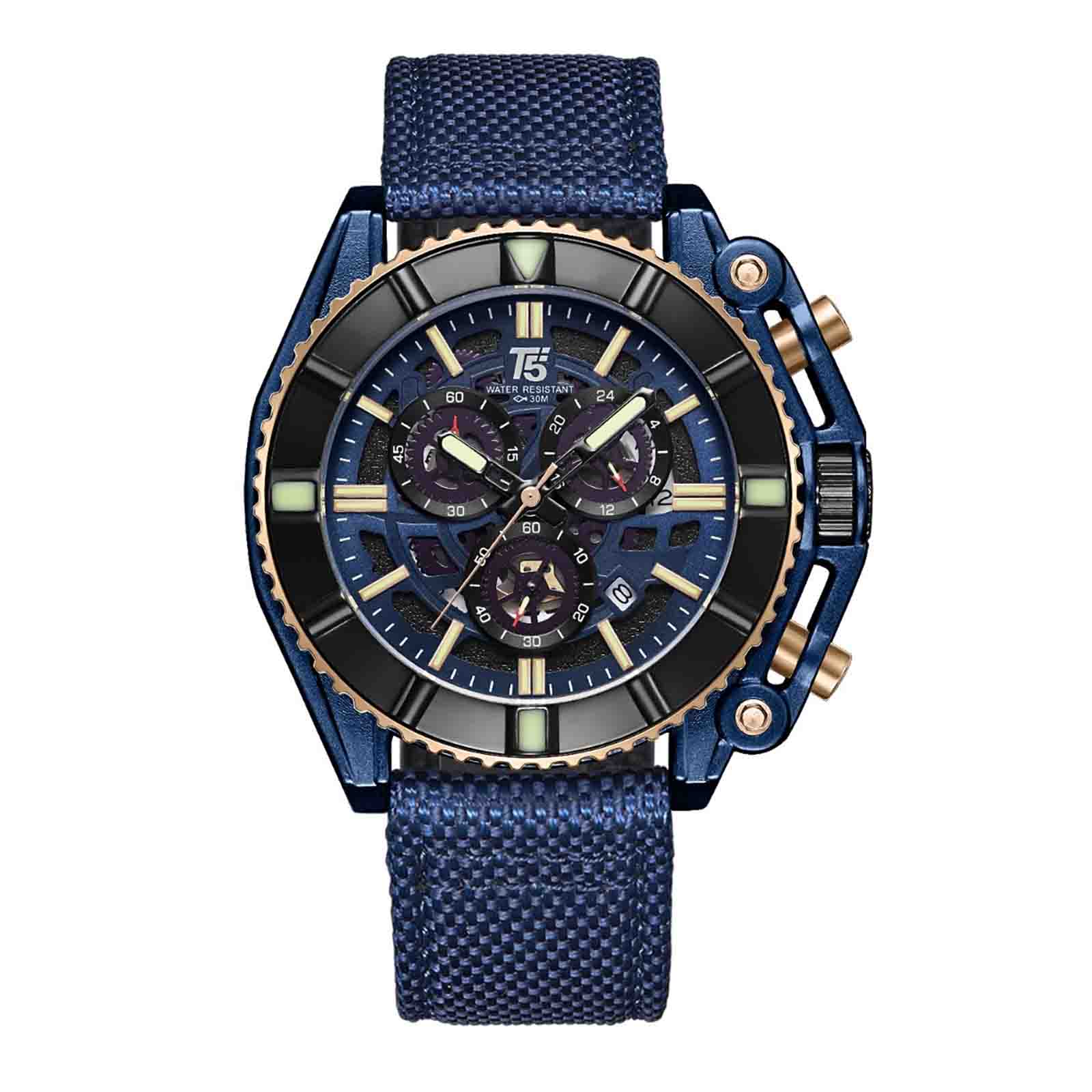ساعت مچی اسپرت مردانه برند تی فایو T5 . سه موتوره ی کرنوگراف ، محصول کشور هنگ کنگ . بدنه ی این ساعت از جنس استیل ضد حساسیت و ضد زنگ ساخته شده . بند های این ساعت از جنس برزنت بسیار مقاوم و محکم ساخته شده که به لطف پین های متحرک دستی ، به شما امکان تعویض راحت بند ها رو میده . به عبارتی دیگه شما میتونید در کنار بند های فابریک ، برای هر رنگ لباس و استایلتون بند هم رنگش رو تهیه کنید و به این صورت برای هر ست از هر رنگ لباس و استایلتون ، بدون مراجعه به تعمیرگاه و بدون نیاز به ابزار به راحتی بند رو تعویض کنید و ساعتی با رنگ بند دلخواهتون داشته باشید . برای خرید بند های اضافه به واتساپ پیام بفرستید .