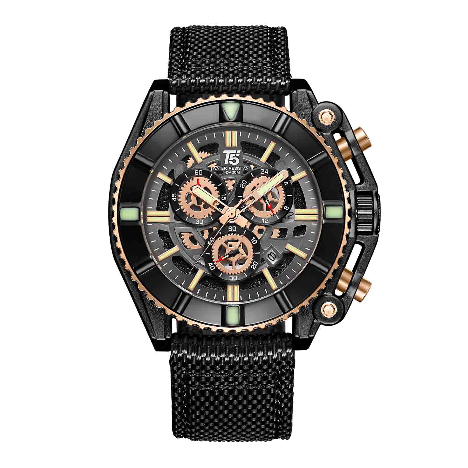 ساعت مچی اسپرت مردانه برند تی فایو T5 . سه موتوره ی کرنوگراف ، محصول کشور هنگ کنگ . بدنه ی این ساعت از جنس استیل ضد حساسیت و ضد زنگ ساخته شده . بند های این ساعت از جنس برزنت بسیار مقاوم و محکم ساخته شده که به لطف پین های متحرک دستی ، به شما امکان تعویض راحت بند ها رو میده . به عبارتی دیگه شما میتونید در کنار بند های فابریک ، برای هر رنگ لباس و استایلتون بند هم رنگش رو تهیه کنید و به این صورت برای هر ست از هر رنگ لباس و استایلتون ، بدون مراجعه به تعمیرگاه و بدون نیاز به ابزار به راحتی بند رو تعویض کنید و ساعتی با رنگ بند دلخواهتون داشته باشید . برای خرید بند های اضافه به واتساپ پیام بفرستید .