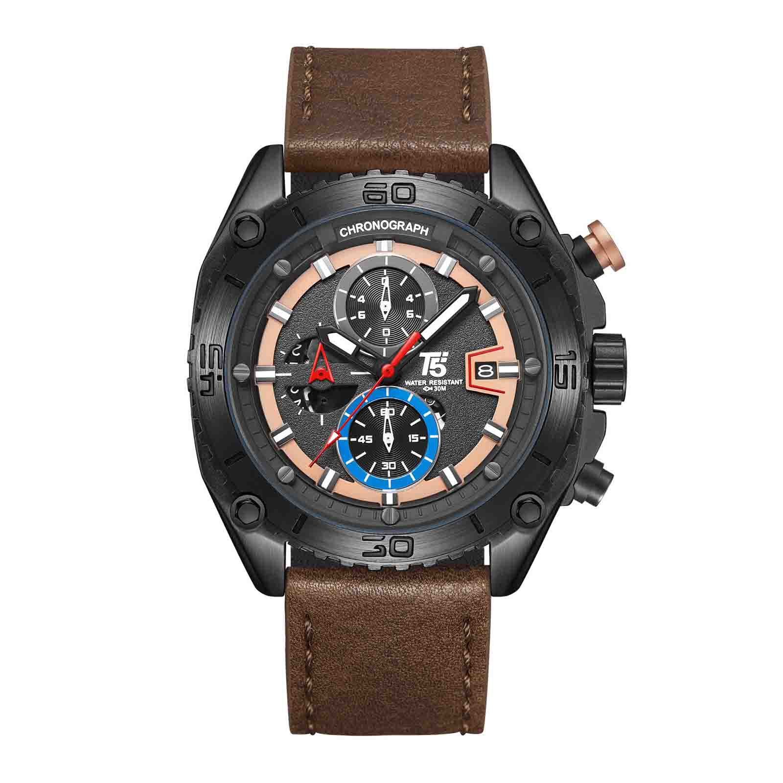 ساعت مچی اسپرت مردانه برند تی فایو T5 . سه موتوره ی کرنوگراف ، محصول کشور هنگ کنگ . بدنه ی این ساعت از جنس استیل ضد حساسیت و ضد زنگ ساخته شده . بند های این ساعت از جنس رابر بسیار لطیف و مقاوم و محکم ساخته شده که به لطف پین های متحرک دستی ، به شما امکان تعویض راحت بند ها رو میده . به عبارتی دیگه شما میتونید در کنار بند های فابریک ، برای هر رنگ لباس و استایلتون بند هم رنگش رو تهیه کنید و به این صورت برای هر ست از هر رنگ لباس و استایلتون ، بدون مراجعه به تعمیرگاه و بدون نیاز به ابزار به راحتی بند رو تعویض کنید و ساعتی با رنگ بند دلخواهتون داشته باشید . برای خرید بند های اضافه به واتساپ پیام بفرستید .