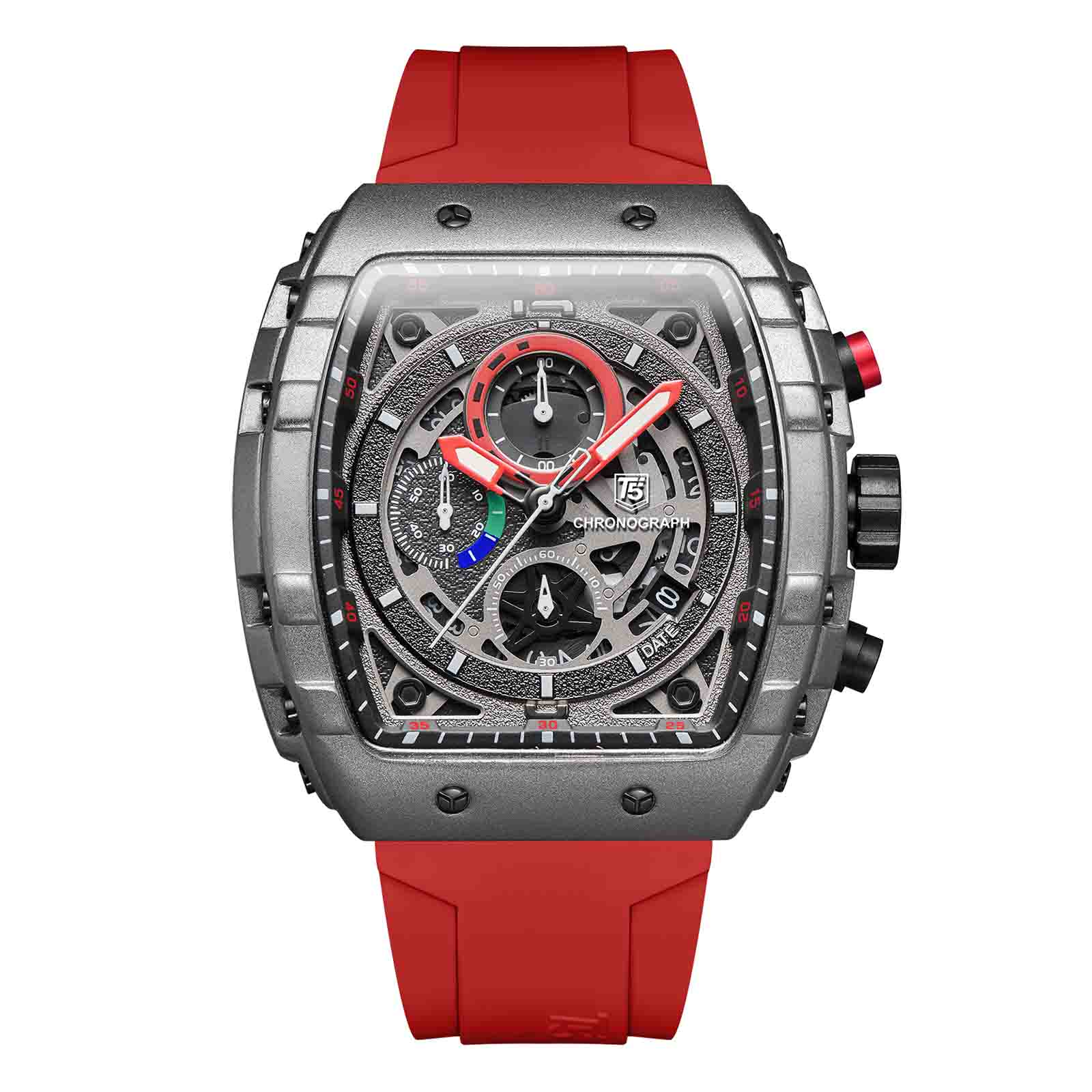 ساعت مچی اسپرت مردانه برند تی فایو T5 . سه موتوره ی کرنوگراف ، محصول کشور هنگ کنگ . بدنه ی این ساعت از جنس استیل ضد حساسیت و ضد زنگ ساخته شده فرم صفحه ی این ساعت به شکل چهار گوش هست که این روز ها در سراسر دنیا ، به عنوان یکی از المان های استایل لوکس و بروز مورد استفاده قرار میگیره . بند های این ساعت از جنس رابر لطیف بسیار مقاوم و محکم ساخته شده که به لطف پین های متحرک دستی ، به شما امکان تعویض راحت بند ها رو میده . به عبارتی دیگه شما میتونید در کنار بند های فابریک ، برای هر رنگ لباس و استایلتون بند هم رنگش رو تهیه کنید و به این صورت برای هر ست از هر رنگ لباس و استایلتون ، بدون مراجعه به تعمیرگاه و بدون نیاز به ابزار به راحتی بند رو تعویض کنید و ساعتی با رنگ بند دلخواهتون داشته باشید . برای خرید بند های اضافه به واتساپ پیام بفرستید .