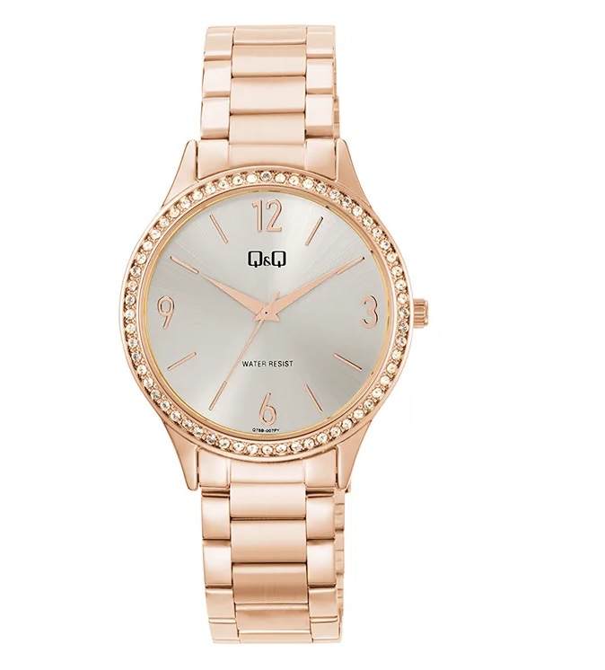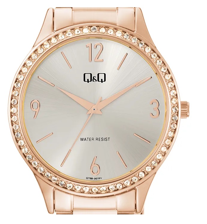 ساعت رزگلد جذاب زنانه کیو اند کیو مدل Q75B-007PY ساعتی از جنس استیل اعداد یونانی و عقربه های سوزنی به همراه نگین کاری های پرس و ثابت اطراف صقحه ، دارای استاندارد ضد آب 30 متر ضد آب و ضد حساسیت برند کیو اند کیو با بسته بندی و جعبه اصلی شرکتی . طراحی این ساعت در کلاس اسپرت هست و برای استایل های روزانه و اسپرت کاملن مناسبه . دارای استاندارد ضد آب30 متر هست که برای شستشو و تعریق دست مناسبه .