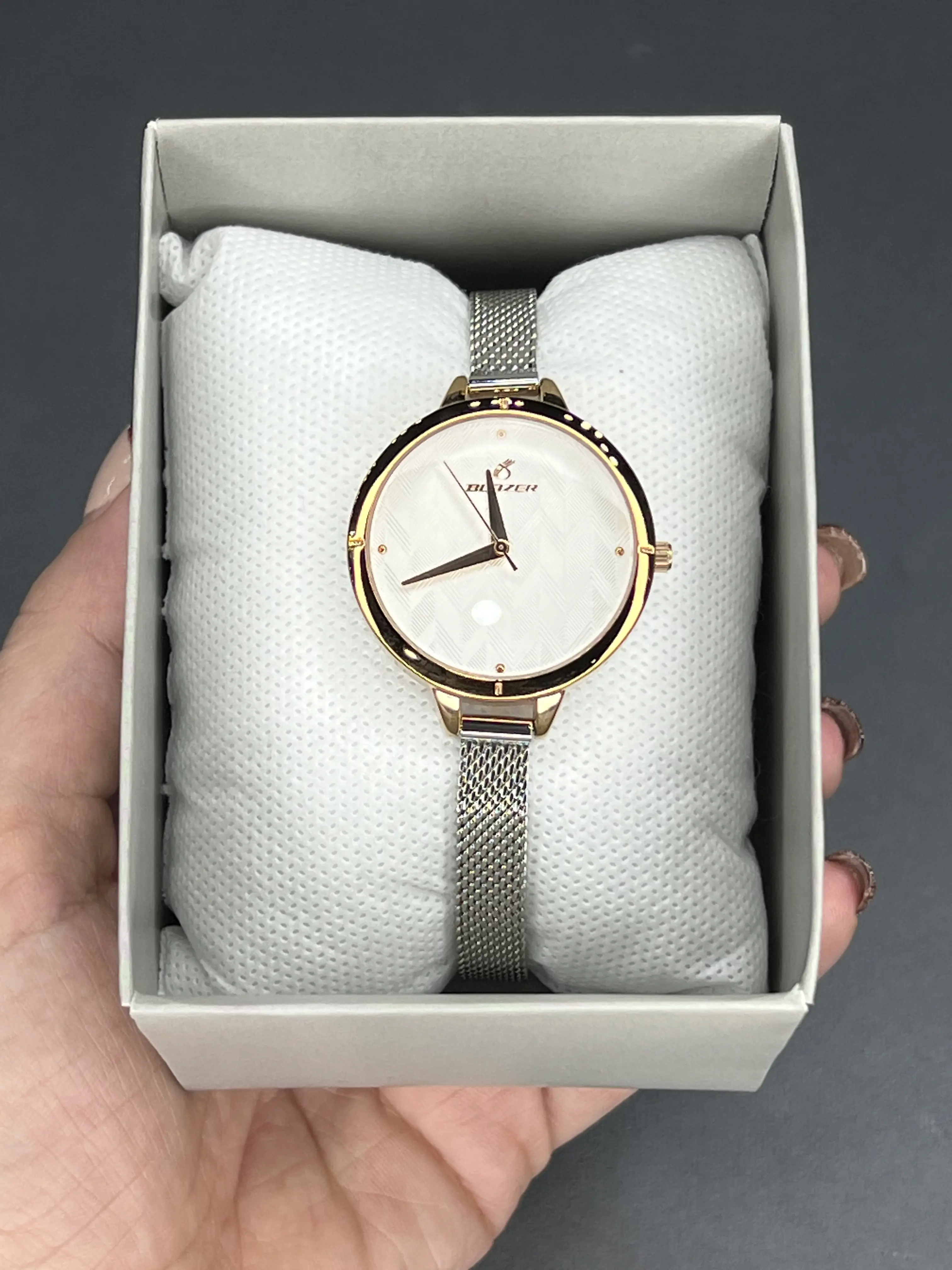 ساعت زنانه بند حصیری طلایی بلیزر . کاملن از استیل ساخته شده و استاندارد ضد آب 30 متر داره که کاملن برای شستشو مناسبه . شیشه ی این ساعت از جنس معدنی و به شکل تراش خورده طراحی شده که به شکل یک جواهر زیبا روی دست شما به چشم خواهد آمد . قفل این ساعت به صورت ضامن دار سگکی هست که به صورت ریلی و راحت قابل تنظیمه تا برای هر سابز مچ دست قابل استفاده باشه .