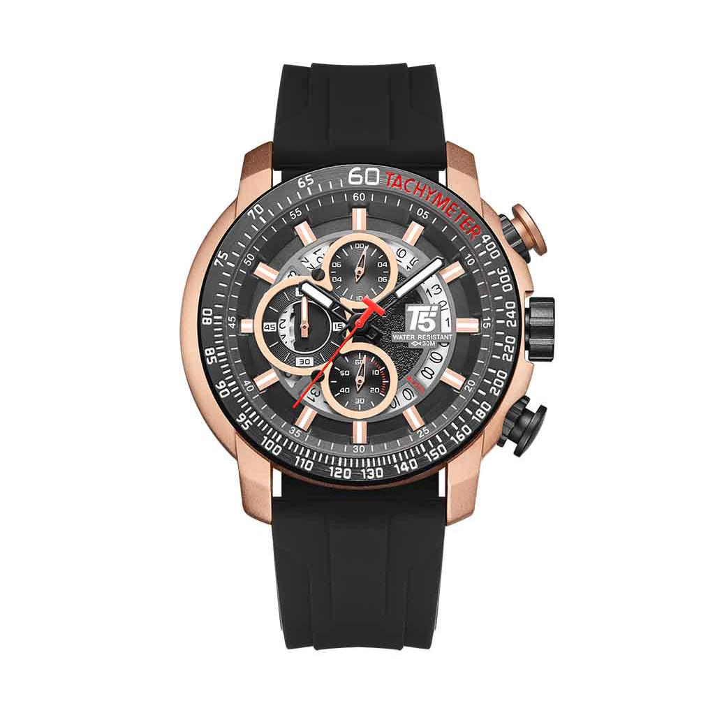 ساعت مچی اسپرت مردانه برند تی فایو T5 . سه موتوره ی کرنوگراف ، محصول کشور هنگ کنگ . بدنه ی این ساعت از جنس استیل ضد حساسیت و ضد زنگ ساخته شده . بند های این ساعت از جنس رابر بسیار لطیف و مقاوم و محکم ساخته شده که به لطف پین های متحرک دستی ، به شما امکان تعویض راحت بند ها رو میده . به عبارتی دیگه شما میتونید در کنار بند های فابریک ، برای هر رنگ لباس و استایلتون بند هم رنگش رو تهیه کنید و به این صورت برای هر ست از هر رنگ لباس و استایلتون ، بدون مراجعه به تعمیرگاه و بدون نیاز به ابزار به راحتی بند رو تعویض کنید و ساعتی با رنگ بند دلخواهتون داشته باشید . برای خرید بند های اضافه به واتساپ پیام بفرستید .