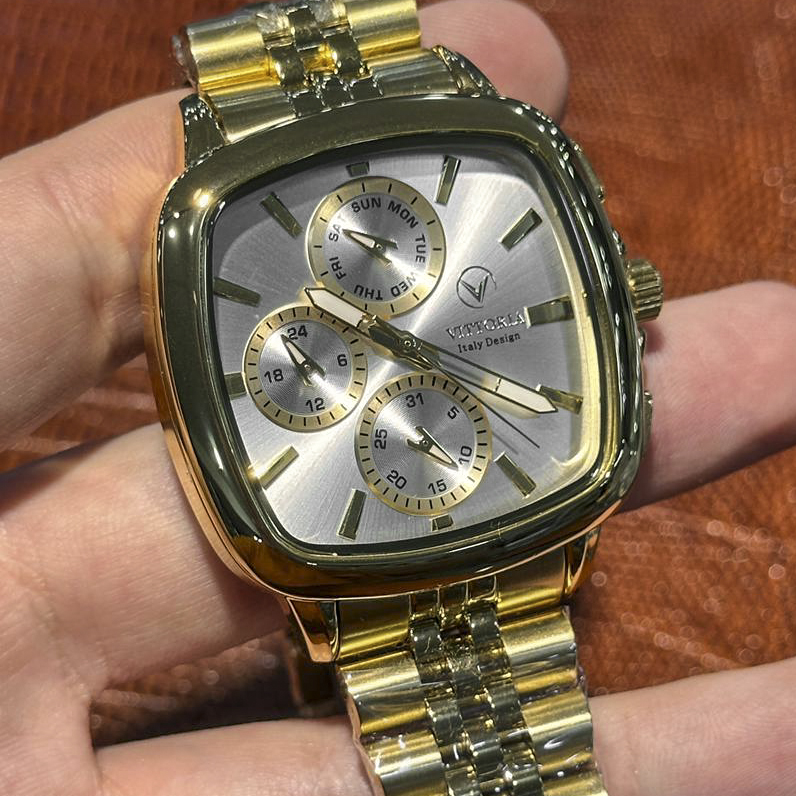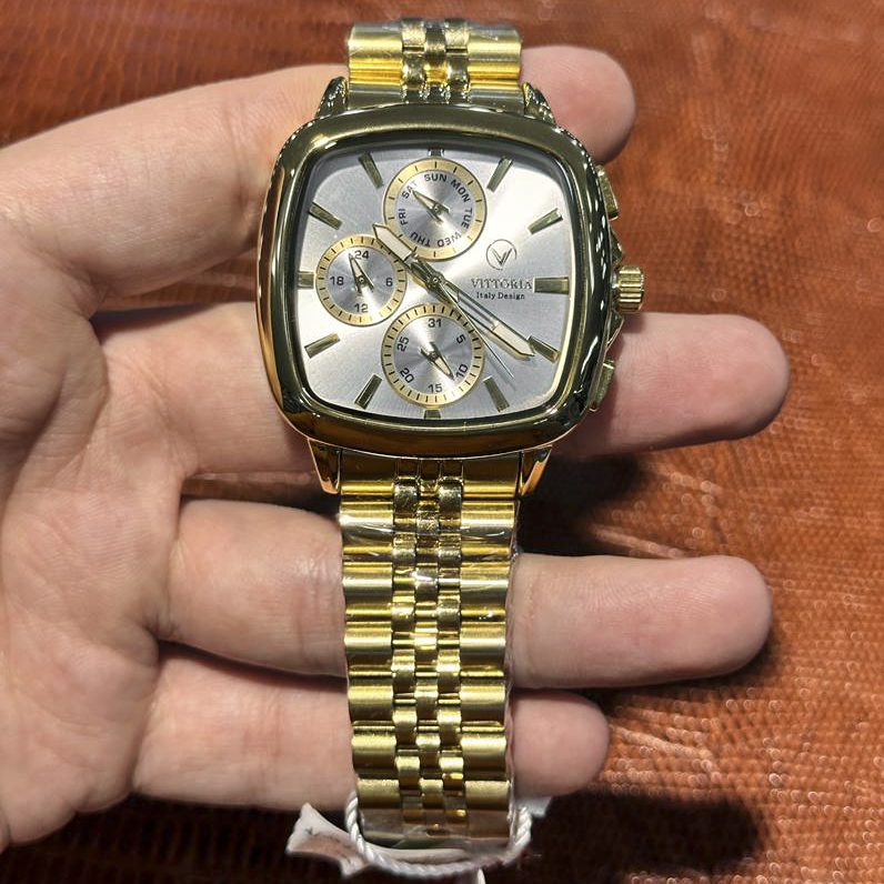 ساعت مربعی ویتوریا مردانه استیل طلایی بند جوبیلی(رولکسی) مدل VT3403 تمام استیل سه موتوره ی فول تایم ، مناسب استایل های اولدمانی ساعتهای مربعی ویتوریا، ترکیبی از طراحی ایتالیایی و استایل خاص. همین حالا ساعت Vittoria مورد علاقهت رو با پرداخت اقساطی در ۴ قسط مساوی از طریق اسنپپی تهیه کن — بدون چک و بدون ضامن